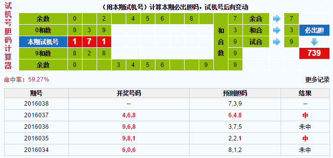 3D试机号胆码计算器:今晚必出胆码739