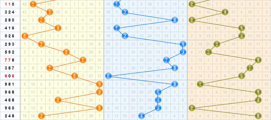 百位:百位上期开出的是2号,2号之前隔了8期开出的,从2号的走势看,本期不看好它的重复的开出。从近期的百位走势来看,最近几期中的百位上跨度开出较大,本期要首先关注百位上的大跨度号码的开出,8号之前隔了28期没开出,是百位上的冷号,本期要预防下8号的回补。本期百位推荐号码:015678