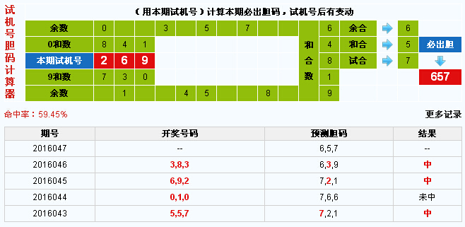 根据3d试机号计算公式计算得出本期胆码为657。这几期胆码计算器的计算结果的准确率还是蛮高的,近四期中有三期的准确率,而本期开出657,这三个号也是近期走势比较突出的。5号球虽然之前走势比较冷,但是近期开出的比较频繁,按照他的规律来看之后继续发展的可能性比较大;6号球在胆码计算器中再次开出就加大了本期开出的可能,并且走势优异,可以重点防一下;7号球的是本期的斜连号,上期斜连号开出可能是带动之后的走势,本期可以关注一下。