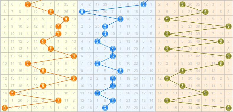 上期开出跨9,从跨度大小走势图分析,这期关注跨度:6、2、7;二码跨度:6、2。