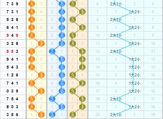 分析近期的和值走势,近期的和值开出都是比较稳定得在第二区域中,上期开出的是两大一小的走势,前期开出的是两小一大,分析近期的大小走势来看,本期看好两小一大的开出。和值推荐:8-20.
