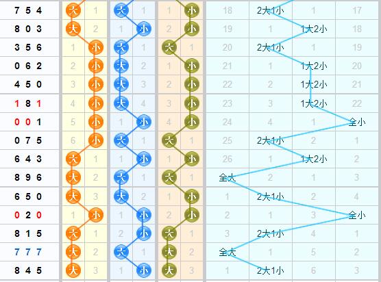 分析近期的和值走势,从近期的和值走势图来看,近期的和值跳动幅度很大,分析近期的大小走势来看,近期的大号的开出较火,本期看好大号的持续开出,从继去年的和值走势来看,本期看好和值17之前的和值开出,本期和值推荐:10-17.