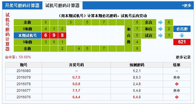 本期3d试机号胆码计算器推荐号码为621,是组六形态,本期可以继续关注组六形态的开出;1号球目前间隔2期未开出,本期可以适当关注它的开出;2号球目前间隔7期未开出,之前就是在间隔7期之后开出的,本期可以继续关注它在间隔7期之后开出;3号球属于近期内走势最冷的号码,已经间隔10期未开出了,本期可以防它的爆冷开出;6号球目前间隔3期未开出,之前有过在间隔3期之后开出,本期可以继续关注它在间隔3期之后开出;8号球和9号球目前都是间隔1期未开出,本期可以关注它们的隔期开出;本期3d试机号后分析专家北斗星第080期综合推荐:123689。