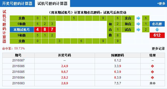 福彩3d第2016087期3d试机号的开奖号码是487,试机号胆码计算器推荐号码612,结合本期试机号数据来看,本期看好2号球和8号球的开出,大小形态重点看好小号球,综合推荐开出124578.