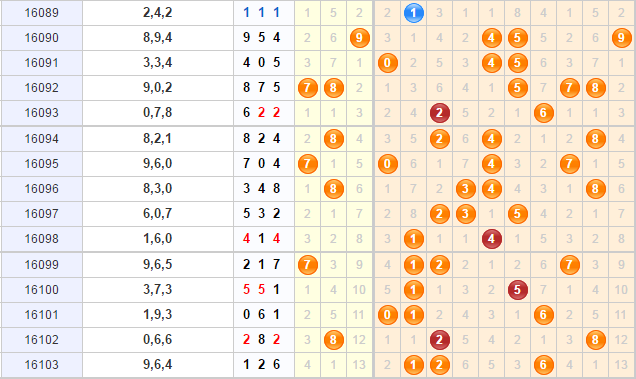 上期的开奖号码是126,开出了小小大和奇偶偶的组六形态,类型上近期组三开出频繁,预测会有一段时间不会开出,本期关注组六形态。本期结合综合走势图,推荐胆码:135689。1号球和6号球均是上期的开奖号码,这两个号码在近期的都出现过连开的情况,本期重复开出的可能很大,本期关注1号球和6号球;结合定胆公式,将前三期的号码对位相加,分别取三个和的和尾作胆码,计算得和尾是369,本期关注369这三个号码的开出;5号球目前间隔3期,近期5号球开出中有间隔3期开出的情况,本期看好5号球的开出;8号球目前间隔1期,近期内8号球多次作为隔期号开出,本期关注8号球的开出。