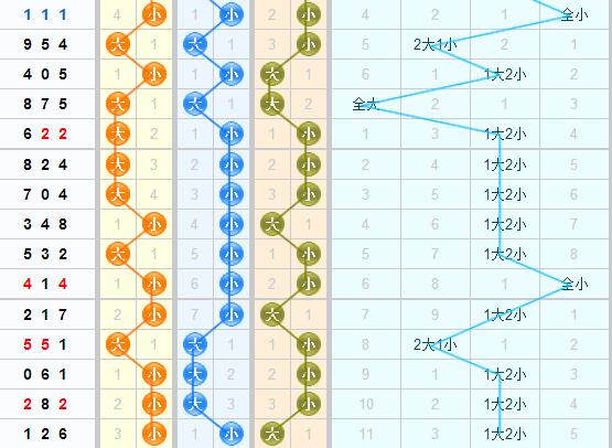 分析近期的和值走势,近期的和值开出浮动较小,近期的大小开出持续的两小一大的开出,分析以往的大小走势来看,本期要适当关注大号的回暖。本期和值推荐:8-21.