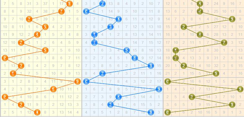 上期开出的跨度值是8,属于大跨度值,近五期的跨度值分别为9-3-4-6-8;开出的跨度值似乎呈现出一边倒的趋势,趋势是向走势图的右边开出,跨度越开越大,本期推荐关注小跨度值的开出;综合推荐:1 2 3 5