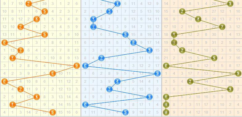 近期10期跨度分别是6-6-5-9-3-4-6-8-1-6,近期大跨部分开出较为集中,小跨略稀疏,本期看好小跨数的开出,推荐2、3跨,防7跨。