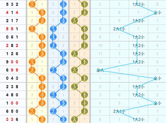 百位:分析近期的百位走势图,百位上期开出的是小号,近期的开出呈大小交叉,本期看好百位上的大号的开出。