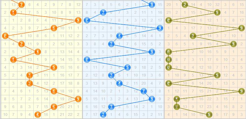 上期开出的和值是11,属于第二区间内的数,与之前的和值10形成了斜连;从之前的走势图上看,和值在第二区间内出现斜连之后,下一期就会开出在第一区间内,所以本期重点推荐关注和值落在第一区间内;综合推荐:7 8 9 14 16