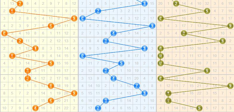近10期开出的和值分别是13-12-1-11-12-7-22-18-10-11,近三期开奖号和值都在第二区间内,由近期和值分布情况看出,近10期有三次相邻和值开出,且都在开出大和值跨度后开出的,由于近期有过第三区间大和值开出过,本期看到第一区间和值开出,推荐和值:2、3、4、6、9防15。
