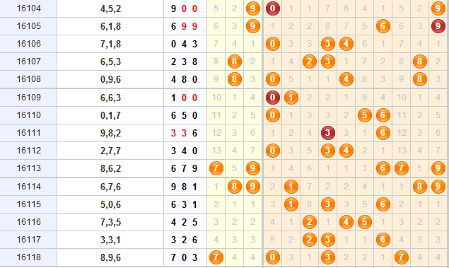 上期的开奖号码是703,开出了大小小和奇偶奇的组六形态,近期组六形态大热,本期继续关注组六的开出。本期结合综合走势图,推荐胆码:012468。 0号球是上期的开奖号码,近期内有过3连开的情况,本期看好0号球的重复开出,关注0号球;结合胆码公式,前三期开奖号码对位相加,取各自的和尾,计算得3个和尾均是4,本期看好4号球的开出;6号球目前间隔1期,而6号球之前3次开出都是作为隔期号开出的,本期6号球开出的可能很大,关注6号球;近期内几乎每期都有邻号开出,本期关注上期开奖号码的邻号12468,综合起来,本期推荐胆码:012468。