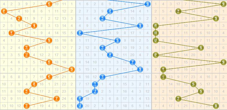 近期10期跨度分别是6-3-4-3-8-5-3-4-7-8,近期跨度一直在奇偶之间来回,且连续两期跨度走向大跨方向,从跨度走势图看,近期每开两期大跨,就有一次小跨的出现,所以本期推荐跨度1、3、5。