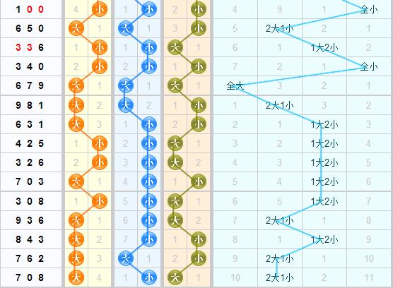 个位:分析近期的个位大小走势,个位上之前是大小重复两期交叉开,上期开出的是大号,本期建议大小都关注。
