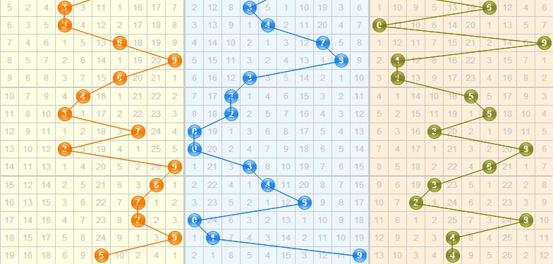 分析近期的和值走势来看,近15期和值由之前的大开大合到逐渐稳定在第二区间内,且多以相同和值连开的形式出现,从奇偶角度看,近期奇数和值尾多呈现连开,偶数和值单期开出,上期开出偶数和尾8,本期关注奇数和尾,推荐和值范围:10-17,重点:13 17