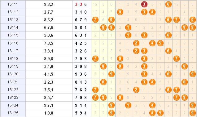 百位:上期百位开出奇数,从走势图上看,百位上连续4期开出奇数,上次开出4期奇数后,就开了偶数,所以本期推荐关注在百位上开出偶数;