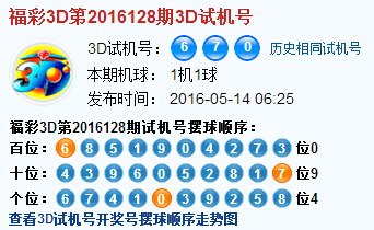 福彩3d第2016128期试机号:670