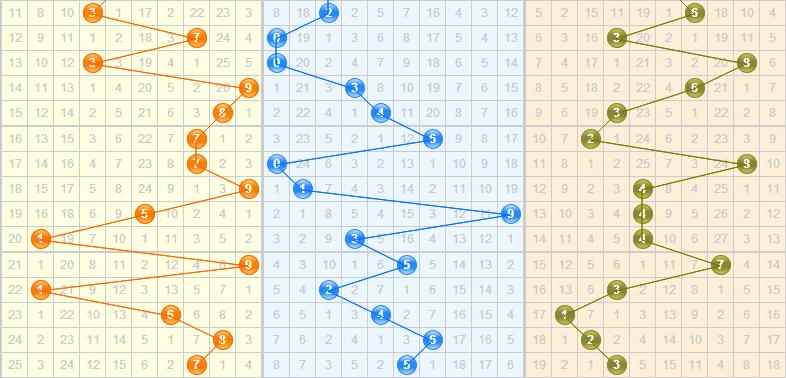 百位:上期开出大数7号,近十期大小比值8:2,根据百位上的大小走势图分析,近期百位上大数占优,呈现多次持续连开的状态,目前已经连续开出3期,从之前的开出情况看,近25期内,有过大数开出一个后间隔开出连续3期的情况,预测本期开3期已到极限,本期较为看好小数反击,关注号码3、4、5。
