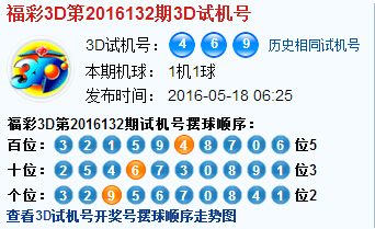 今日3d试机号的开奖号码是469,目前有一期没有开出试机号的号码了,根据近期的试机号跟开奖号码的规律来看,发现隔一期开出试机号的号码还是比较频繁的,所以本期的试机号号码需要关注一下。