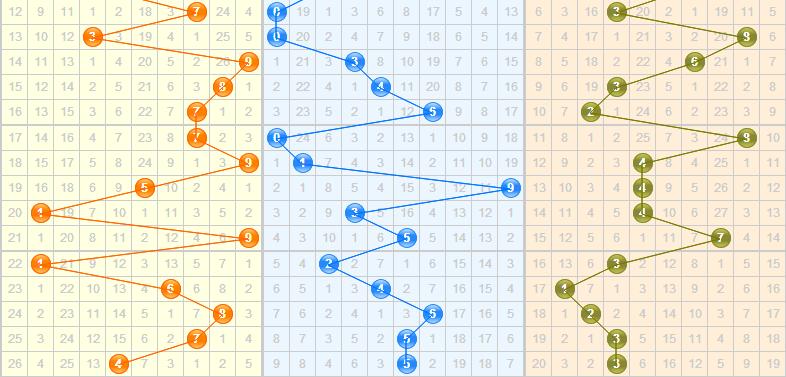 近期10期跨度分别是8-8-5-3-4-2-5-6-4-2,近期跨度从跨又走向了小跨,呈现一个斜形的闪电形状,且振幅都较小,本期继续看好小幅度跨度的产生,防一下极限大跨,推荐跨度:1、3、5防9。