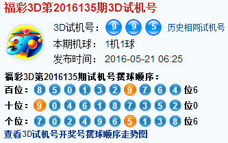 根据以上3d试机号开奖结果分析,今日3d试机号的开奖号码是995,近期的开奖结果都有开出试机号的号码,通过对3d近期的走势来看,5号球跟9号球都有开出的几率,所以本期这两个球都要关注一下。
