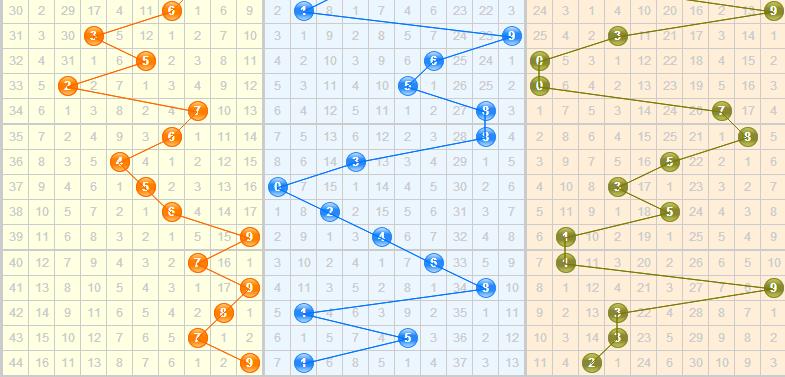 上期开出小跨度4跨,近十期跨度2-2-5-4-8-6-1-7-4-8,近期大小度跨交叉开出,跨度振幅在减小,慢慢向右移动,本期看好大跨继续开出,推荐跨度:5、6、8。