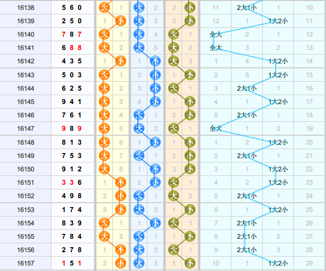 百位:分析近期的百位大小走势来看,近20期内,百位上的大小走势偏向于大号,小号20期内只开出7期,其余的17期开的都是大号,上期小号连开,本期继续推荐小号。