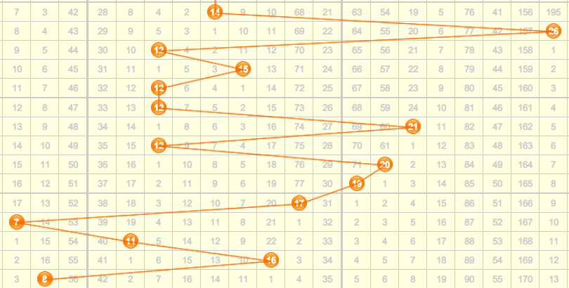 上期和值为8,是一个比较小的和值,从和值的走势图来看,近五期的和值范围一直在和值的第一区域和第二区域徘徊,上期开出了第一区域的8和值,本期推荐关注第二区域的和值,本期和值推荐:9 10 11 12 13 14