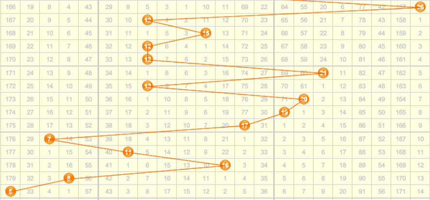 上期的和值开出了遗漏了100多期的和值5,近期的和值处于第一区域和第二区域之间开出,结合近期的和值走势来看,本期和值的关注点在第二区域内,重点关注5的倍数的和值开出,本期和值推荐:10 13 14 15 17 20