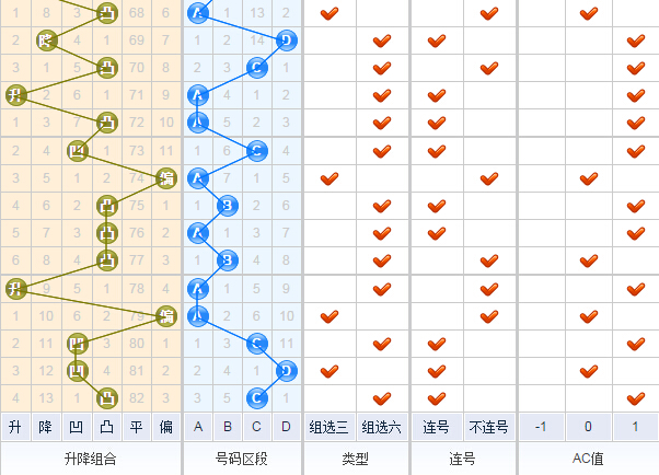 升降组合:上期开出凸组合,近段时间总体来看走势相对比较稳定的就是凸组合了,按照目前的局势来看,本期最有可能开出的号码组合就是降或者是凹组合,在选好号码的同事可以参考这个选项对号码进行定位哦!