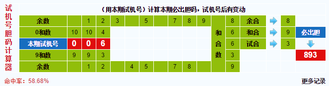 彩票3d试机号胆码计算器推荐893,8号球跟9号球是上期的开奖号码,也就是重复号,近期的重复号都有开出来,但是一般都只开一个,所以这两个号码预计会开出一个,重点关注8号球;3号球目前是隔了5期了,近期3号球开始走冷,本期不看好3号球的开出。