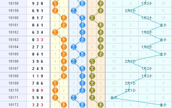 十位:上期开出小数2号,近十期大小比值3:7,根据十位上的大小走势图分析,近期十位上小数的开出很有规律,几乎是隔期连开的情况,大数呈现单期开出,上期隔期开出小号,本期看好大数开出,推荐十位号码5、7、8。