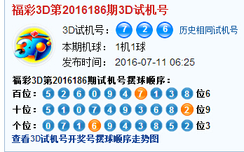 今日3d试机号的开奖号码是726,近3期中3d开奖号码都有开出试机号中的一个号码,所以本期关注试机号中的一个号码,试机号开出的三个号码中,比较看好的是6号球的开出。
