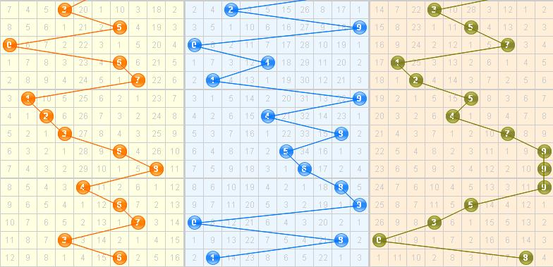 跨度分析:近期跨度振幅极小,基本都是斜连相邻开出的跨度,慢慢在大跨区域走动,本期继续看好大跨,推荐跨度6、9跨。