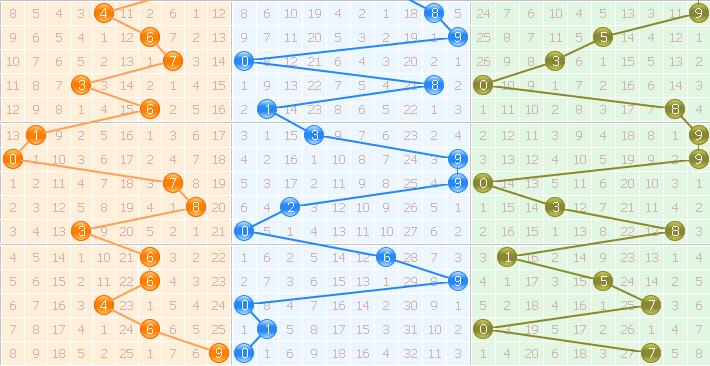 跨度分析:近期跨度一直停留在大跨区域内,上期还开出了最大跨9跨,根据近期振幅走向,预计跨度慢慢向左移动,关注跨度5、8跨,防3跨。