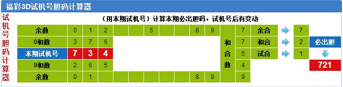 彩票3d试机号胆码计算器推荐721,1号球是上期的开奖号码,本期的重复号建议关注1个;2号球目前是隔期号码,近期的话小号比较热,本期2号球需要关注一下;7号球试机号也开出来了,所以本期防一下它的开出。