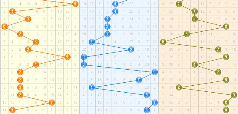 上期开出大跨7跨,近期跨度频繁在大小跨之间来回,中间穿插一次小的振幅,本期看好振幅落点在大跨,推荐本期跨度5、6、9防4。