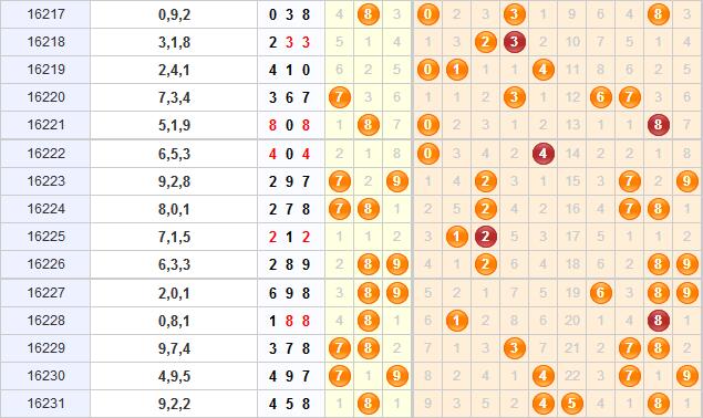 上期开出组六形态,和值开出17、跨度开出4、偶奇偶、小大大、合质合。观察近期的综合走势图,本期看好组六形态的开出(适当的防组三)。