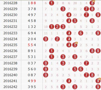 百位:上期百位开出奇数,近期百位上奇数的连开并不好,最近开出的4次奇数都没有出现连开,所以本期看好百位上偶数的开出,同时防百位奇数的连开。