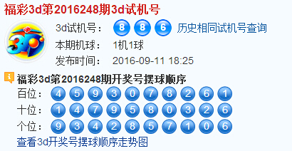根据以上3d试机号开奖结果分析,今日3d试机号的开奖号码是886,8号球目前是遗漏了7期了,从近期的走势来看,8号球是目前第二冷的号码,而且试机号开出了2个,所以本期的8号球开出的几率是非常大的,需要关注;6号球目前是隔了2期了,近期的6号球由冷转热,本期还是比较看好会开出的。