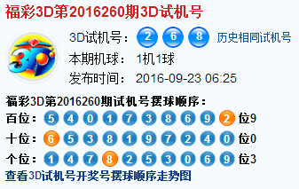今日3d试机号的开奖号码是268,2号球是上期的开奖号码,目前已经重复开出2期了,近期的重复号有连续开出4期或者以上的,所以本期的2号球需要关注;6号球目前是一个隔期号码,隔期号需要关注;8号球也是重复号码,防一下。