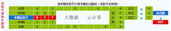 今日3d试机号的开奖号码是617,试机号胆码计算器推荐号码621,从本期试机号推荐号码来看,本期比较看好6号球的开出,上期开奖号球开出061,本期奇数号球反弹的概率比较大,所以本期看好两奇一偶比的形态开出,奇数号球中比较看好3号球,7号球,上期大小形态开出小大小,本期大号球有回补开出的趋势,所以本期依旧以大号球开出为主,重点看好形态大大小和小大大的形态开出,类型方面上期开出组六,本期继续看好组六开出。