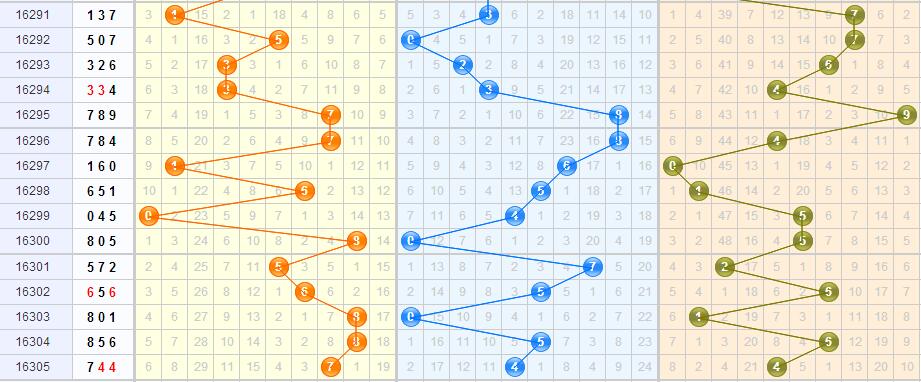 个位数是最难判断的,开出4到9有2次,到7、0有1次。首先排除1路的号,再排遗漏期数多的3、8,几率小的6、2,本期选择0、5、9。