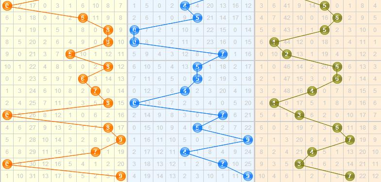 跨度分析:上期跨度为2,近期跨度开出的振幅极不稳定,根据近期跨度的落点分析,本期推荐跨度1、4、5、6。