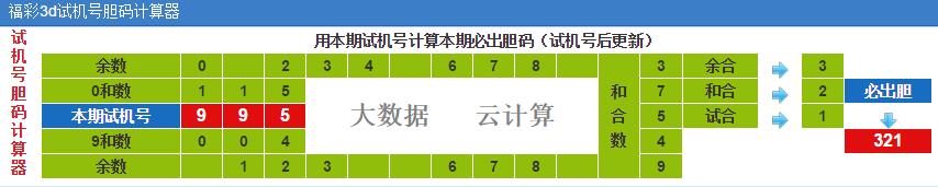 本期3d试机号胆码计算器给出的结果是321,是一个拖拉机形态的号码,从近期的遗漏情况来分析,1号球间隔4期,与上一次1号球开出的间隔期一样,本期1号球开出机会是比较大的,2号球此时遗漏了6期,近期2号球有过间隔5期和间隔7期开出的情况,这样来看2号球还是比较符合近期的开出周期的,可以关注下2号球;3号球目前间隔1期,近期也有过作为隔期号开出的情况,关注3号球;和3号球同样的,0号球也需要重点关注。