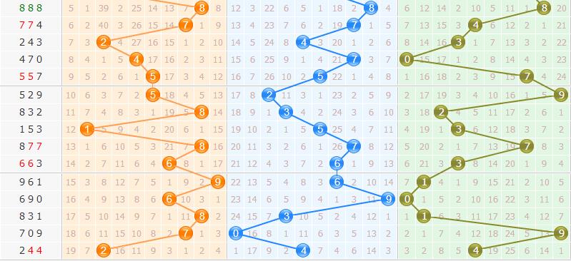 和值分析:近期和值基本徘徊于第二区间内,且又有往左走的趋势,本期主要防的是许久未露面的大和值,主要推荐和值范围在13-20。