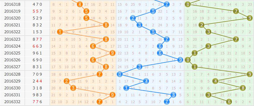 和值分析:上期开出重复和值20,近期和值多数徘徊在中后部区域内,小和值被遗忘多期,本期依旧要防,主要看好还是第二区间和值,推荐和值范围在6-17之间。
