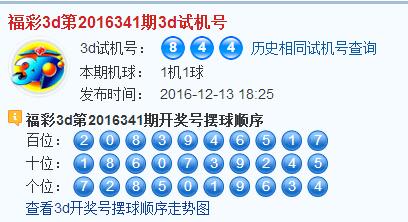 今日3d试机号的开奖号码是844,4号球是上期的开奖号码,也就是重复号,本期重复号需要关注;8号球已经隔了6期了,近期已经连续3期开出了隔了6期的号码,所以本期8号球开出的概率非常的大。