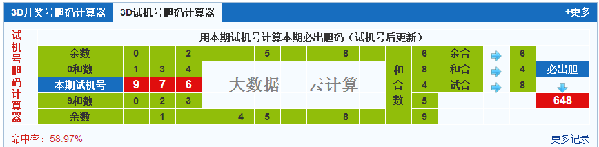 彩票3d试机号胆码计算器推荐648,6号球与试机号重复,本期重点防6。4号球是上期的邻码,也是隔期号,本期可以小防一下4号球;8号球目前已经遗漏了8期,本期不需多加考虑。