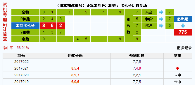 本期试机号胆码计算器的结果:775